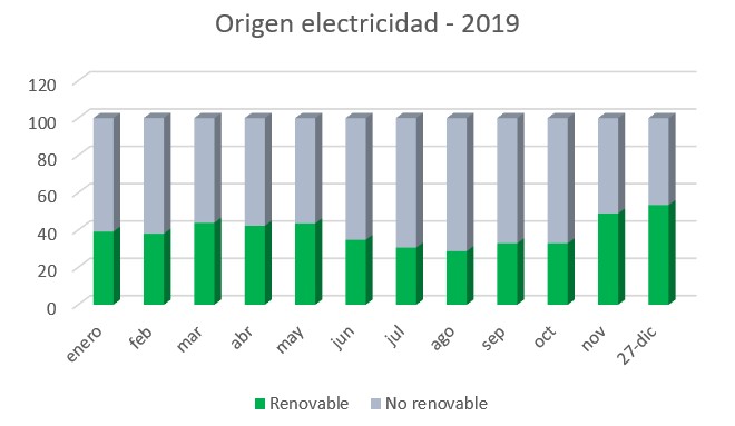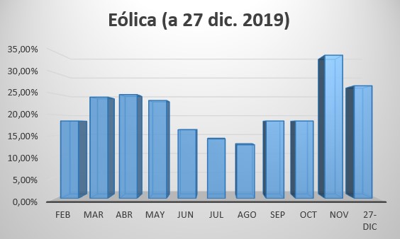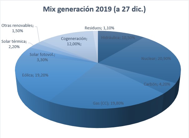 Diciembre ha sido el primer y único mes de 2019 en el que las renovables han generado más de la mitad de la energía. La aportación extraordinaria de eólica (26,9%) e hidráulica (22,6%) a raíz de la cadena de borrascas ha reducido la presencia del gas en el mix al 12,9%.