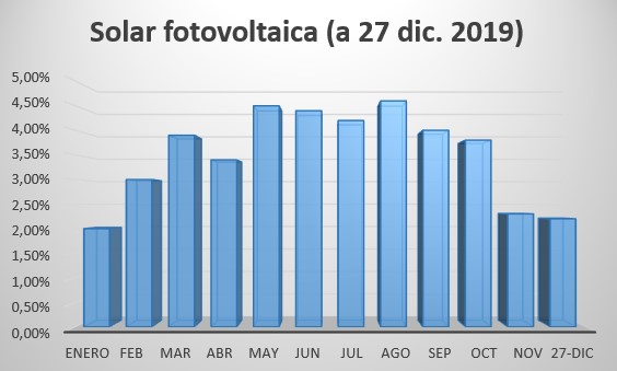 La solar fotovoltaica ha sido la tecnología renovable que más ha incrementado su potencia instalada en 2019, un 66%. Su producción eléctrica ha crecido también, un 48,4%. Sin embargo, su presencia aún es muy baja. Como muestra la siguiente gráfica, su periodo más productivo fue de mayo a septiembre. El pico lo marcó en agosto alcanzando apenas un 4,6% del mix.
