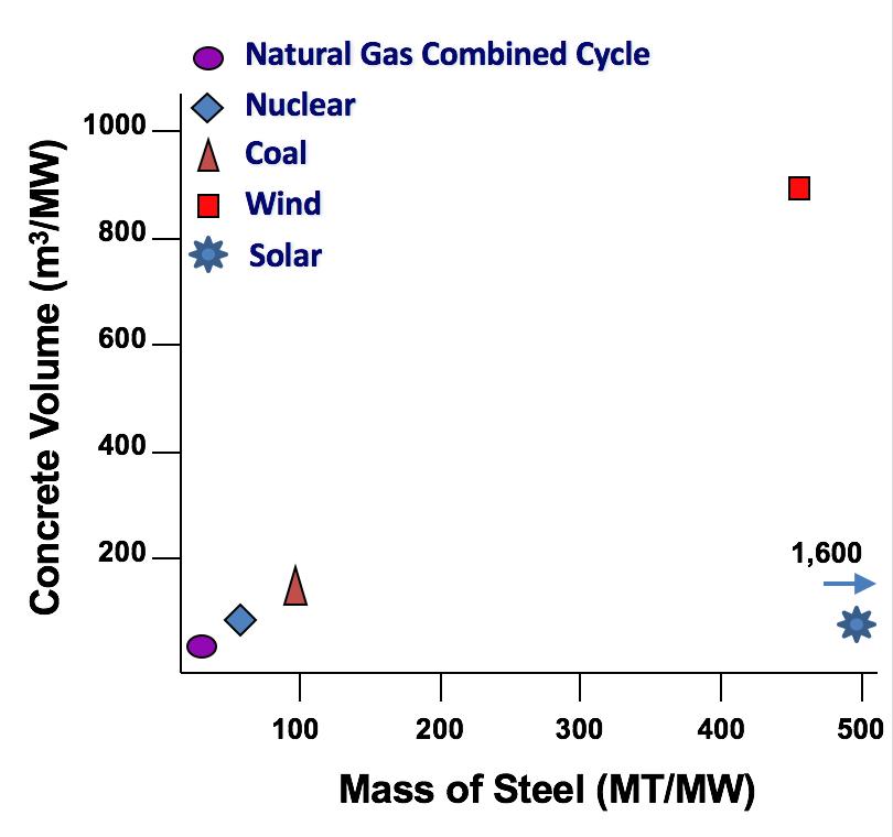 La cantidad de acero y hormigón necesaria para construir las distintas plantas de energía varía enormemente. La energía solar y eólica consumen más acero que cualquier otra fuente de energía. El gas natural y la nuclear necesitan lo mínimo. La solar necesita 1.600 toneladas de acero por MW, la energía eólica necesita más de 400 toneladas de acero, mientras que el gas y la nuclear solo necesitan 4 y 40 toneladas, respectivamente, según recoge James Conca en un artículo en Forbes.