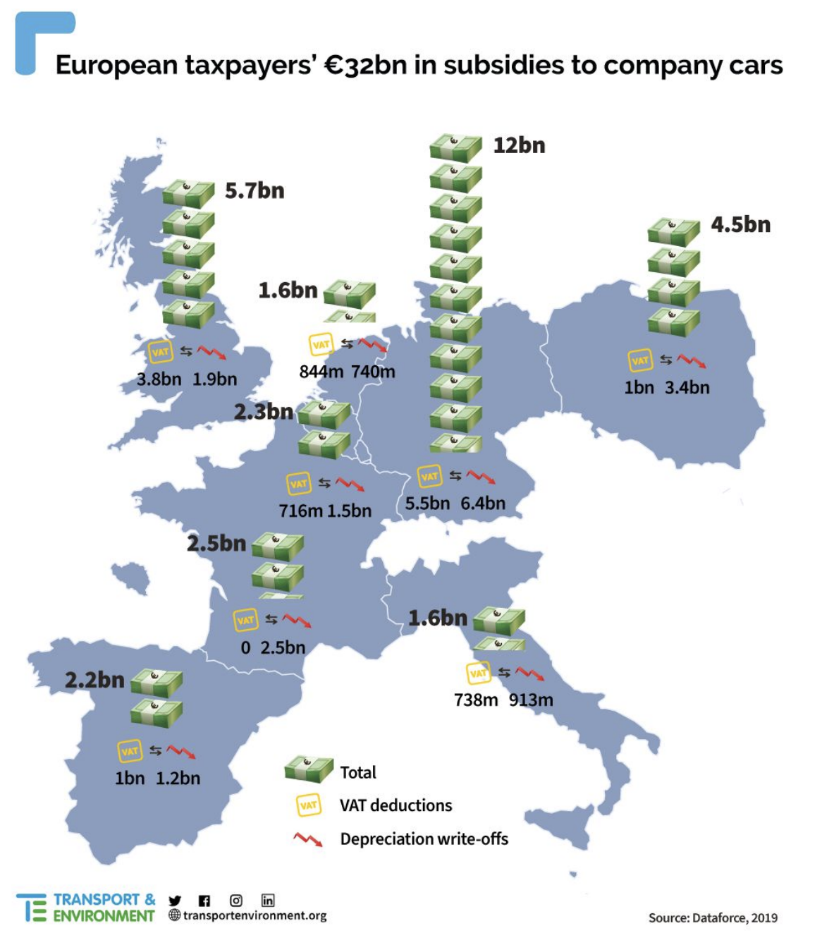 Esto se debe a que cada uno de estos vehículos llega a duplicar la distancia conducida en comparación con los coches de uso particular. El grupo ecologista Transport & Environment (T&E), que encargó el estudio realizado por Dataforce, declaró que los gobiernos deberían terminar con las deducciones de IVA y las amortizaciones para vehículos con combustibles fósiles, y orientar a las flotas corporativas hacia el uso de vehículos libres de emisiones.