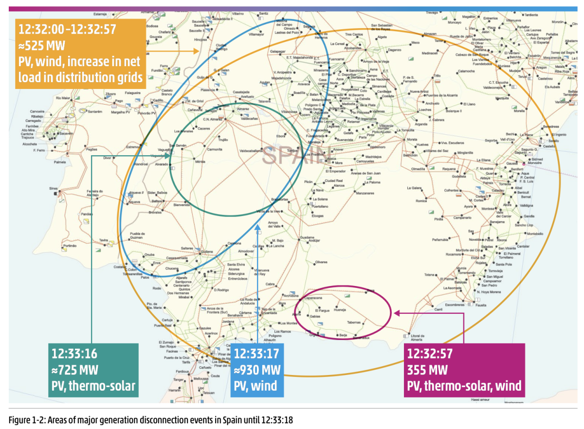 Aquí una de las claves del incidente. ¿Por qué las renovables no pueden absorber reactiva? Según el informe de Entso-e, el siguiente evento consistió en dos series de caídas, lo que resultó en una pérdida adicional de alrededor de 725 MW de energía fotovoltaica y térmica. Posteriormente, entre las 12:33:17 y las 12:33:18:020, se produjeron varios disparos que provocaron la desconexión de la generación eólica y solar en Segovia, Huelva, Badajoz, Sevilla y Cáceres, por un total aproximado de 930 MW (o incluso más de 1100 MW, como indica la variación de frecuencia). Algunos de estos disparos se debieron a la protección contra sobretensiones, pero la mayoría son desconocidos.