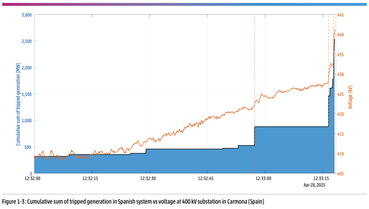 Entso-e lo explica de esta manera: "Dado que algunas unidades de generación consumían potencia reactiva, lo que reducía la tensión, las desconexiones de estas unidades sin una compensación adecuada de la pérdida de potencia reactiva por parte de otros recursos del sistema con capacidad para inyectar/absorber potencia reactiva provocaron un aumento de la tensión en el sistema, no solo en España, sino también en Portugal. Además, la frecuencia disminuyó".