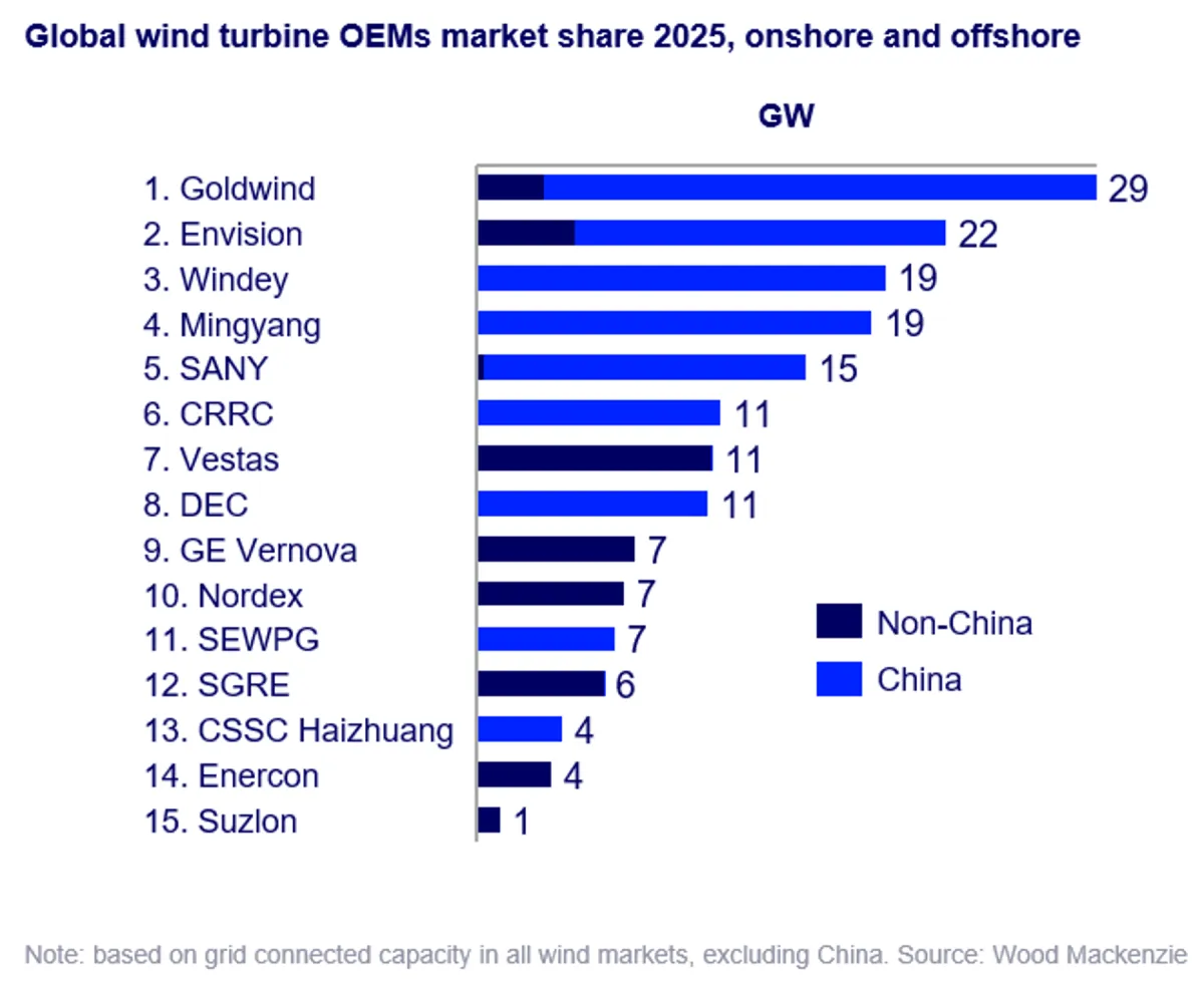 Goldwind y Envision lideraron el grupo. Por primera vez, dos fabricantes de turbinas superaron los 20 GW de instalaciones. Su impulso refleja un modelo estratégico basado en escala, precios competitivos y despliegue rápido. La fuerte expansión doméstica de China y su creciente presencia en mercados emergentes respaldan este enfoque.