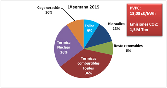 Según datos de REE, en estos primeros siete días la eólica ha generado el 43,7% de la electricidad demandada por los españoles. Como consecuencia, el PVPC (sin incluir impuestos) de los consumidores residenciales ha bajado por primera vez desde mayo de 2014 por debajo de los 0,10 €/kWh, alcanzando una media aritmética para los primeros siete días del año de 0,914 €/kWh, un 29,8% inferior a la de la primera semana de 2015 (de 0'1303 €/kWh). También se sitúa un 24% por debajo de la media aritmética horaria del PVPC de 2015 (0,12,08 €/kWh)