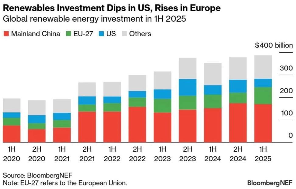 Están surgiendo señales de cierta reasignación de capital desde Estados Unidos hacia Europa, mientras la energía solar a pequeña escala fue la ganadora sorpresa en el primer semestre de 2025