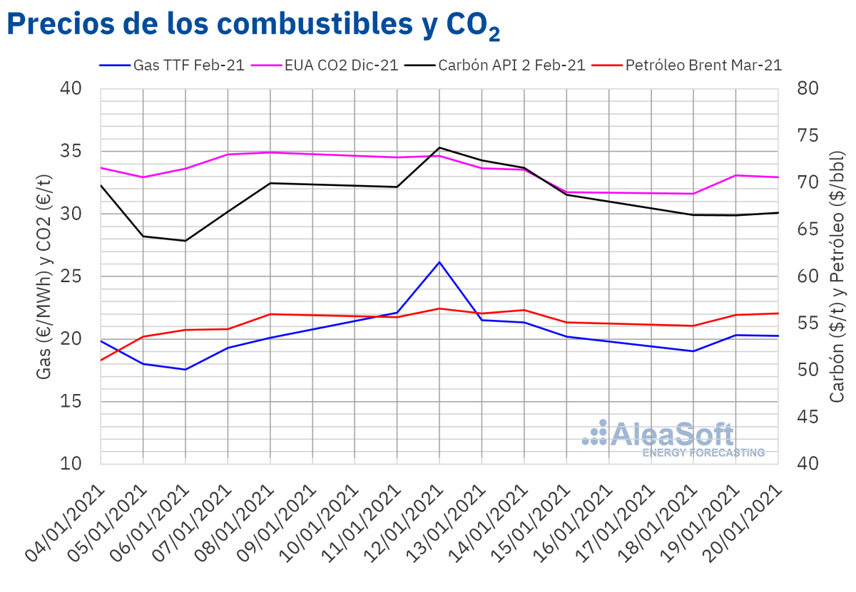Los precios de cierre de los futuros del petróleo Brent para marzo de 2021 en el mercado ICE estuvieron en el entorno de los 55 $/bbl en los primeros tres días de la tercera semana de enero, llegando el miércoles 20 de enero a 56,08 $/bbl.