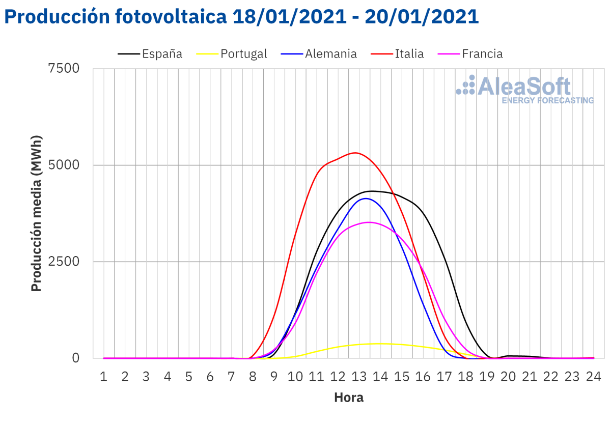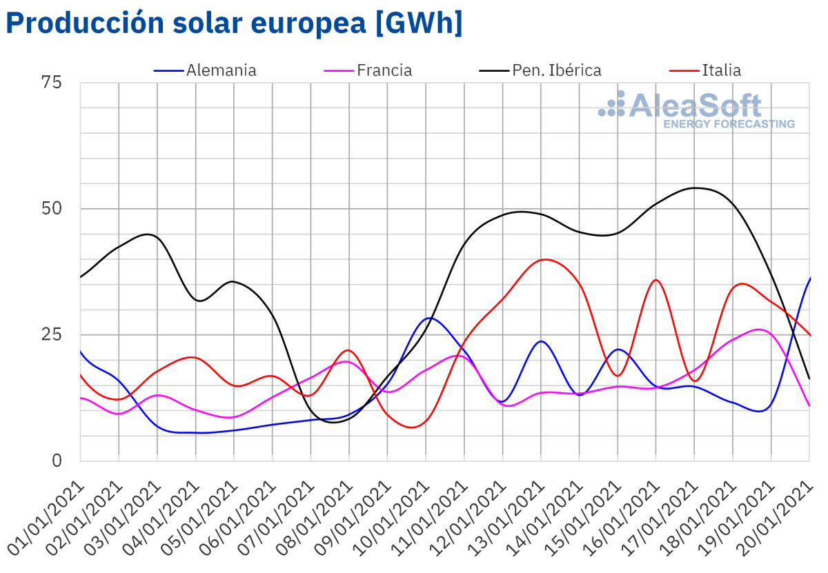 La producción solar de los primeros tres días de la semana que comenzó el 18 de enero aumentó en los mercados de Alemania, Italia y Francia al compararse con la producción promedio registrada durante la segunda semana de enero. El mercado francés fue el de mayor aumento, de un 32%. Sin embargo en la península ibérica la producción descendió un 28%.