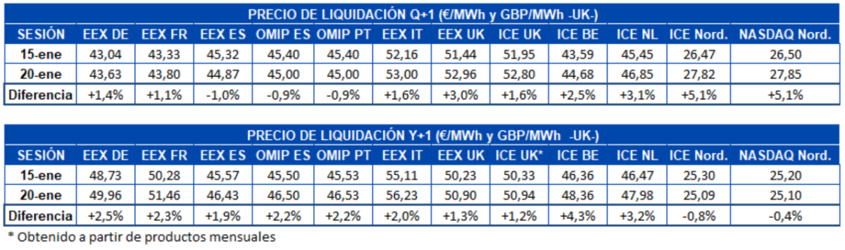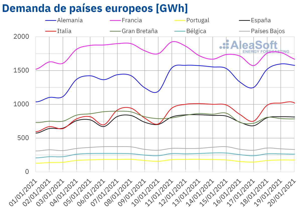 La demanda eléctrica registrada entre el 18 y el 20 de enero bajó en la mayoría de los mercados europeos si se compara con la de los tres primeros días de la semana anterior favorecida por el aumento de las temperaturas medias, que fue superior a los 3 °C en el caso de España. El mayor descenso de la demanda se produjo en los mercados de Francia y Portugal, en ambos casos de un 5,7%. Sin embargo, en el mercado italiano, donde las temperaturas medias fueron 0,6 °C más frías, la demanda aumentó un 2,5% en este período.
