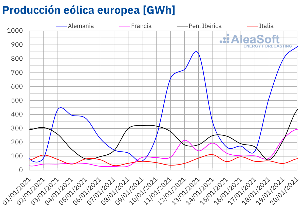 En el caso de la producción eólica, al comparar la que se registró entre el 18 y el 20 de enero con la de la semana anterior, se observa un aumento en casi todos los mercados. A la cabeza de estos ascensos se encuentra Portugal, con un 168%. En esta comparación los mercados de España e Italia mostraron descensos del 5,9% y 8,4% respectivamente, pero en España la producción del día 20 y la prevista para el día 21 fueron más altas que las de la semana anterior, lo que propició la disminución de los precios en el mercado MIBEL.