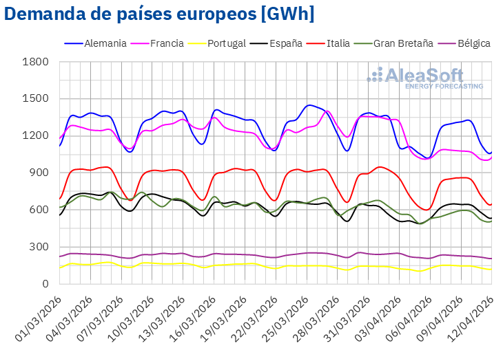 Fuente: Elaborado por AleaSoft Energy Forecasting con datos de ENTSO-E, RTE, REN, Red Eléctrica y TERNA.Fuente: Elaborado por AleaSoft Energy Forecasting con datos de ENTSO-E, RTE, REN, Red Eléctrica y TERNA.
