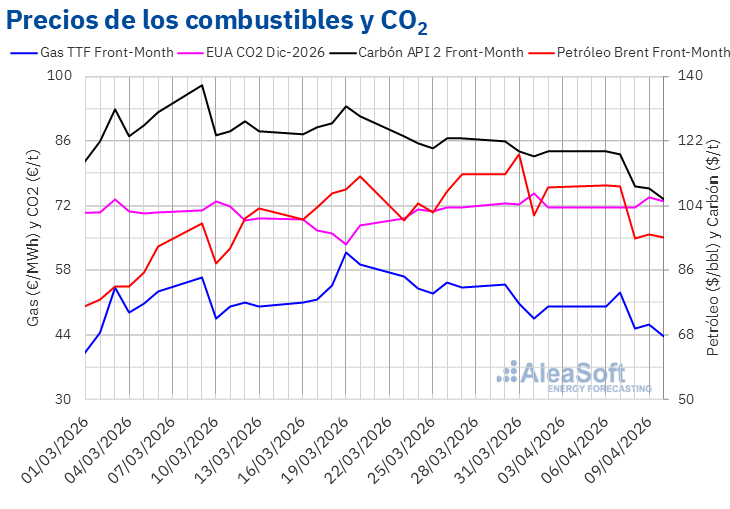 Por lo que respecta a los precios de cierre de los futuros de derechos de emisión de CO2 en el mercado EEX para el contrato de referencia de diciembre de 2026, el martes 7 de abril registraron su precio de cierre mínimo semanal, de 71,53 €/t. Posteriormente, los precios aumentaron y el jueves 9 de abril estos futuros alcanzaron su precio de cierre máximo semanal, de 73,72 €/t. El viernes 10 de abril, el precio de cierre fue de 72,84 €/t. Según los datos analizados en AleaSoft Energy Forecasting, este precio todavía fue 1,6% mayor al de la última sesión de la semana anterior.