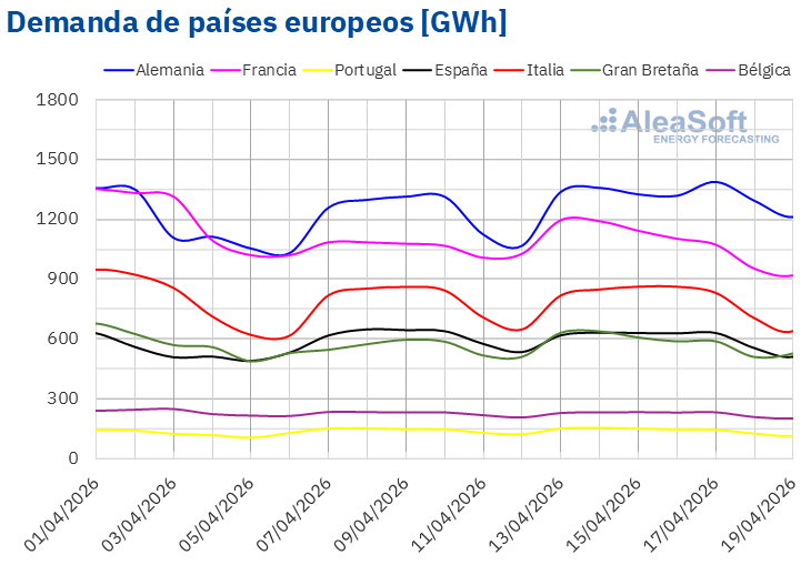 Para la semana del 20 de abril, según las previsiones de demanda de AleaSoft Energy Forecasting, la tendencia positiva se revertirá y la demanda disminuirá en los mercados alemán, francés, italiano y británico. En el mercado portugués se mantendrá similar mientras que en los mercados español y belga la demanda aumentará.