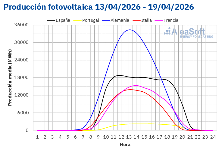 Durante la semana del 20 de abril, según las previsiones de producción solar de AleaSoft Energy Forecasting, la producción solar aumentará en los mercados alemán e italiano. Sin embargo, en el mercado español la producción fotovoltaica disminuirá.
