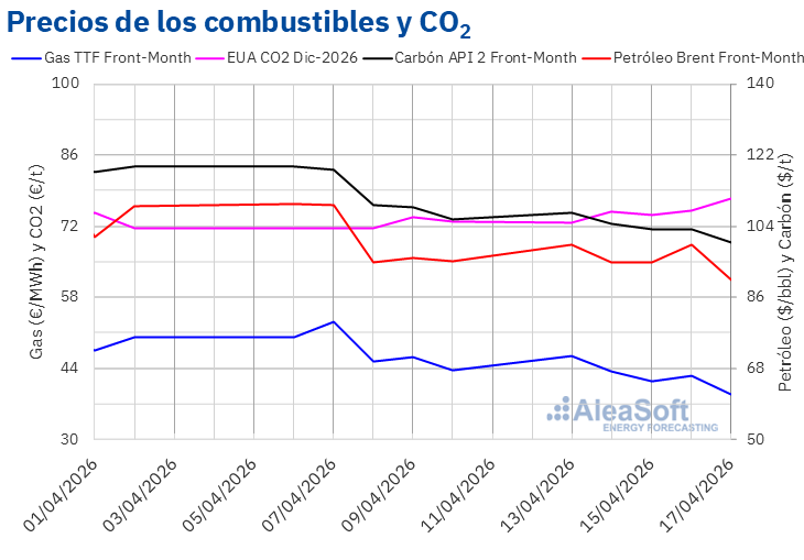 Por lo que respecta a los futuros de derechos de emisión de CO2 en el mercado EEX para el contrato de referencia de diciembre de 2026, el lunes 13 de abril, registraron su precio de cierre mínimo semanal, de 72,61 €/t. El resto de la semana, los precios de cierre se mantuvieron por encima de 74 €/t. El viernes 17 de abril estos futuros alcanzaron su precio de cierre máximo semanal, de 77,48 €/t. Según los datos analizados en AleaSoft Energy Forecasting, este precio fue un 6,4% mayor al de la última sesión de la semana anterior y el más alto desde el 12 de febrero.