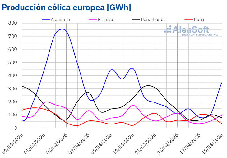 En la semana del 20 de abril, según las previsiones de producción eólica de AleaSoft Energy Forecasting, la producción eólica aumentará en los mercados portugués, francés y alemán. En los mercados español e italiano la producción eólica disminuirá.