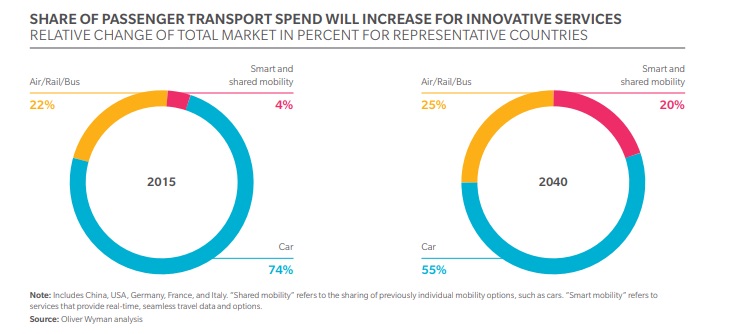 Los nuevos servicios de movilidad generarán en 2040 unos ingresos de 237.000 millones de euros y unos beneficios a proveedores de hasta 131.000 millones de euros, según se desprende del estudio 'Movilidad 2040. Cruzada por la movilidad inteligente', elaborado por Oliver Wyman.