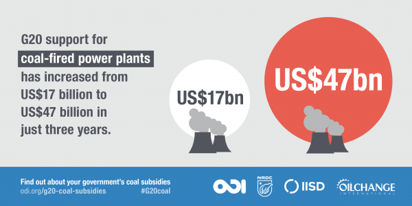 Para empeorar las cosas, ante las recientes tendencias mundiales hacia un crecimiento de energía limpia, ODI descubrió que el apoyo financiero de los gobiernos para la producción de energía a base de carbón en realidad había aumentado en los últimos años, creciendo desde un soporte de poco más de 17.200 millones al año de media en el periodo 2013-14 a casi 47.300 millones al año de media en 2016-2017.
