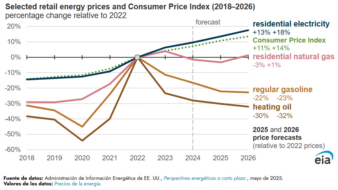 Los precios minoristas de la electricidad han aumentado a un ritmo superior a la inflación desde 2022 y, según las previsiones de la EIA, se prevé que seguirán aumentando hasta 2026. Las zonas del país con precios de electricidad relativamente altos podrían experimentar mayores aumentos que aquellas con precios de electricidad relativamente bajos.