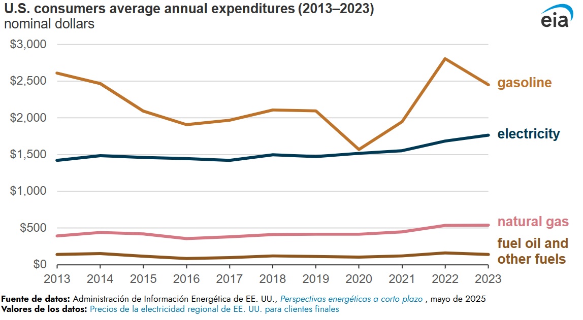 Los consumidores estadounidenses gastaron un promedio de aproximadamente $1,760 en electricidad en 2023. Entre los gastos relacionados con el combustible, el gasto en electricidad solo es superado por la gasolina, cuyo promedio fue de casi $2,450 en 2023, según los datos más recientes disponibles de la Encuesta de Gastos del Consumidor de la Oficina de Estadísticas Laborales de EEUU. Las fluctuaciones anuales en el gasto en electricidad tienden a ser más moderadas que las de los precios de la gasolina, que suelen seguir las fluctuaciones de los precios mundiales del petróleo crudo.