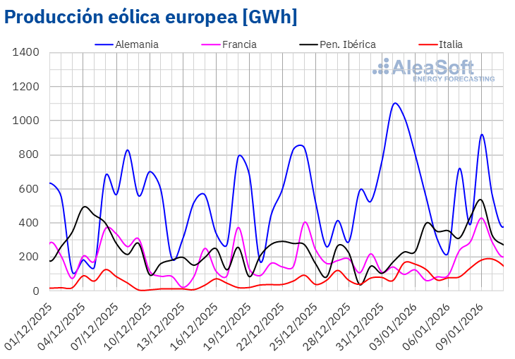 Además, los mercados español e italiano batieron récords históricos de producción eólica. En España, este hito se produjo el viernes 9 de enero, cuando la producción eólica alcanzó los 453 GWh de generación. Un día después, el 10 de enero, la producción eólica en Italia registró 188 GWh de generación. Por su parte, el mercado francés alcanzó su segunda mayor producción eólica de la historia para un día de enero, también el 9 de enero, con una generación de 429 GWh, tras la registrada el 28 de enero de 2025, de 437 GWh.