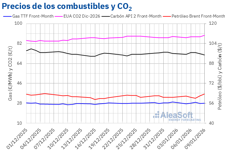 Por lo que respecta a los futuros de derechos de emisión de CO2 en el mercado EEX para el contrato de referencia de diciembre de 2026, el lunes 5 de enero registraron su precio de cierre mínimo semanal, de 87,25 €/t. Durante el resto de la semana, los precios aumentaron. Como resultado, el viernes 9 de enero, estos futuros alcanzaron su precio de cierre máximo semanal, de 89,56 €/t. Según los datos analizados en AleaSoft Energy Forecasting, este precio fue un 1,4% mayor al del viernes anterior y el más elevado al menos desde el 29 de diciembre de 2023.