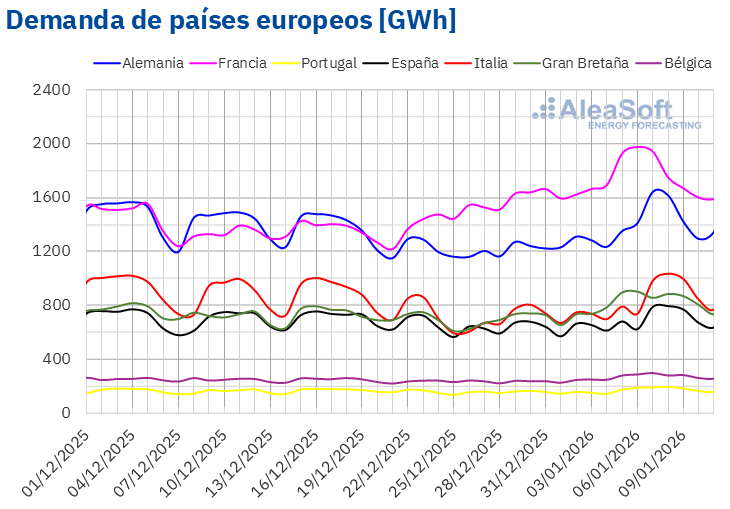 Fuente: Elaborado por AleaSoft Energy Forecasting con datos de ENTSO-E, RTE, REN, Red Eléctrica y TERNA.Fuente: Elaborado por AleaSoft Energy Forecasting con datos de ENTSO-E, RTE, REN, Red Eléctrica y TERNA.