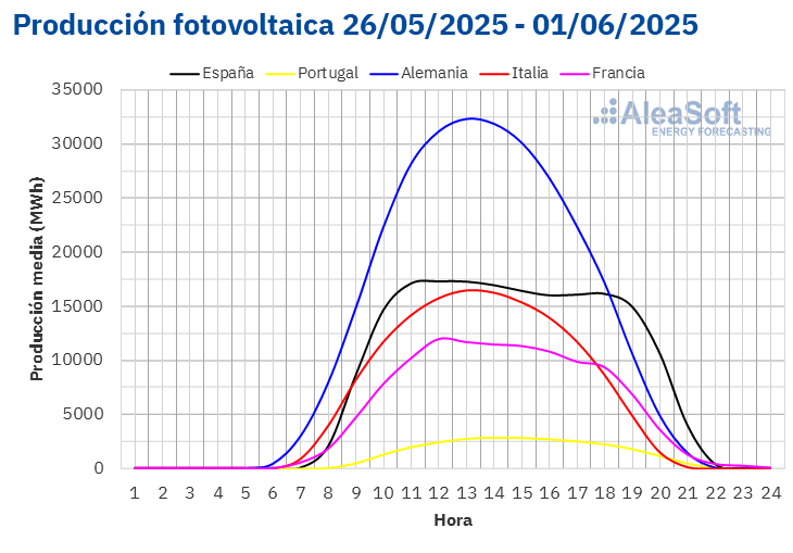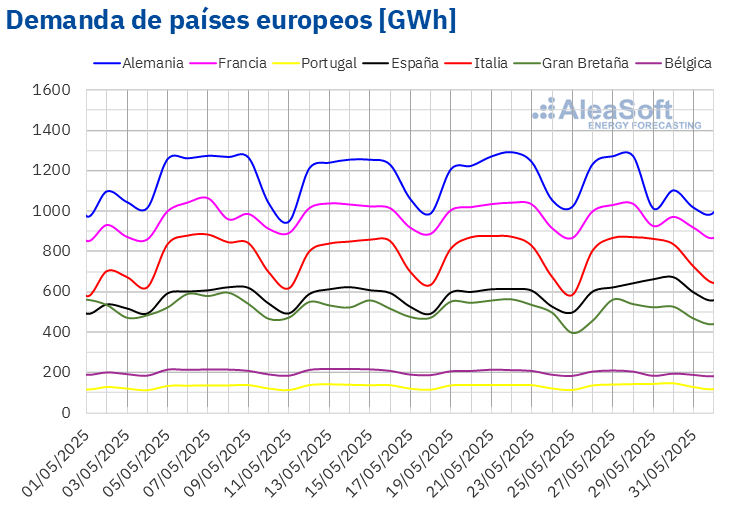 Fuente: Elaborado por AleaSoft Energy Forecasting con datos de ENTSO-E, RTE, REN, Red Eléctrica y TERNA.Fuente: Elaborado por AleaSoft Energy Forecasting con datos de ENTSO-E, RTE, REN, Red Eléctrica y TERNA.