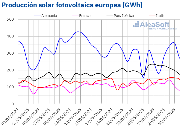 A lo largo de la semana, los mercados de Portugal, España, Francia e Italia registraron récords de producción solar fotovoltaica. El martes 27 de mayo, Portugal batió su récord histórico con una producción de 28 GWh. Ese mismo día, España alcanzó su mayor valor diario de producción con esta tecnología en un mes de mayo, con 205 GWh, cifra que también representa el segundo valor más alto de su historia. El 30 de mayo, Francia e Italia lograron sus máximos históricos de producción solar fotovoltaica, con 143 GWh y 156 GWh, respectivamente.