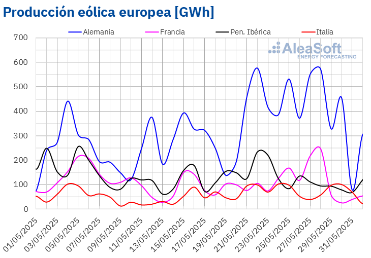El 28 de mayo, el mercado francés alcanzó su segunda mayor producción eólica para un mes de mayo en la historia, con 247 GWh.