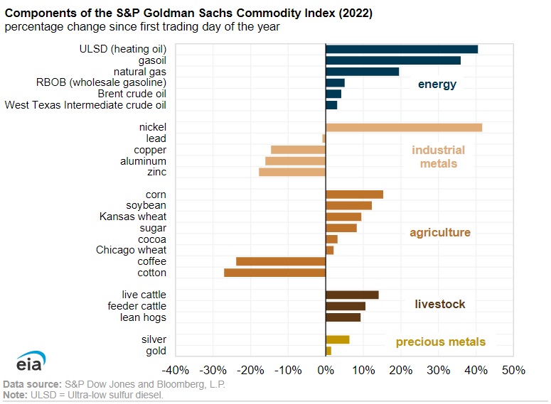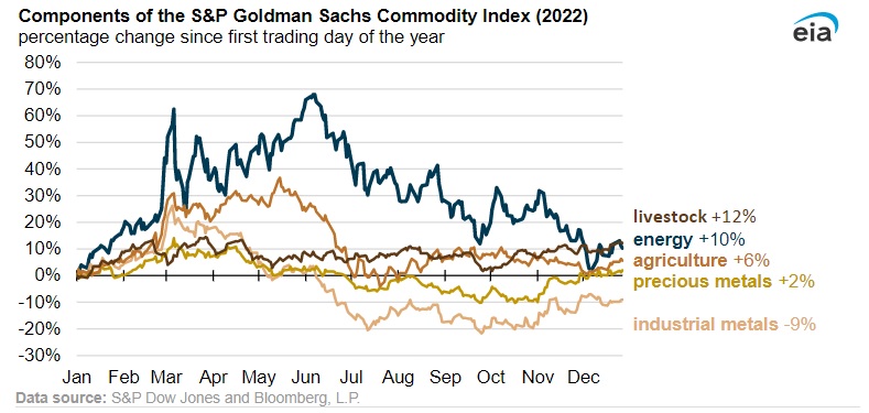 El componente energético del S&P Goldman Sachs Commodity Index (GSCI) terminó el año un 10% por encima del primer día de cotización de 2022.