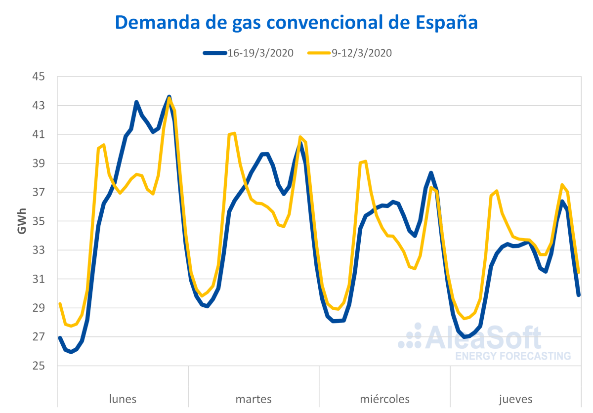 En la demanda de gas convencional el descenso en el período analizado fue de un 0,9%, aunque en gran parte esta bajada se debe a que el 19 de marzo fue festivo en algunas comunidades autónomas. Entre el lunes y el miércoles la demanda convencional fue similar o superior a la de la semana pasada. Por una parte, esto se debió a que las temperaturas fueron 2,3 °C más frías que la semana pasada. Además, ha aumentado el consumo de algunas industrias que deben hacer frente a algunas necesidades derivadas de la crisis del COVID-19, tales como la industria alimenticia, la química y la de papel. Lo que sí se ha modificado en el consumo convencional respecto a la semana pasada es la distribución horaria, pues ha bajado la demanda entre las hora 1 y 10 y ha subido entre las horas 11 a 20. Este cambio en el patrón se debe a la disminución del consumo en el horario comercial y al aumento en el horario doméstico.