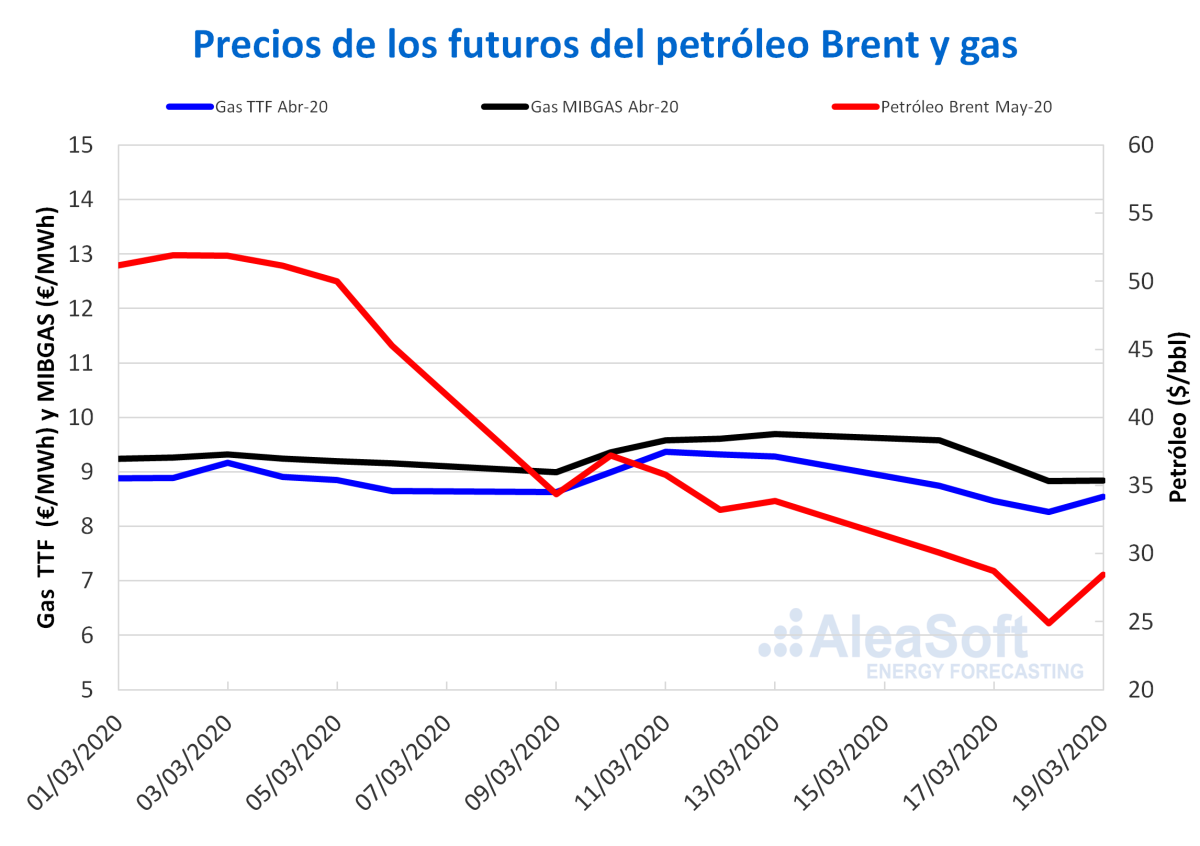 Los precios de los futuros de petróleo Brent para el mes de mayo de 2020 en el mercado ICE, iniciaron este mes con un precio de cierre de 51,90 $/bbl, registrado el día 2 de marzo. Pero los precios han descendido hasta alcanzarse el miércoles 18 de marzo un precio de cierre de 24,88 $/bbl. Este valor es un 52% inferior al precio de cierre de la primera sesión del mes y hay que destacar que no se registraban precios tan bajos como este desde abril de 2003. En la sesión de ayer 19 de marzo los precios se recuperaron después de que el Banco Central Europeo, el Banco de Inglaterra y la Reserva Federal de Estados Unidos anunciaran medidas de estímulo a la economía y cerraron en 28,47 $/bbl, es decir, 3,59 $/bbl por encima de la sesión anterior. De momento hoy se está manteniendo esta recuperación y se ha llegado a valores por encima de los 30 $/bbl.