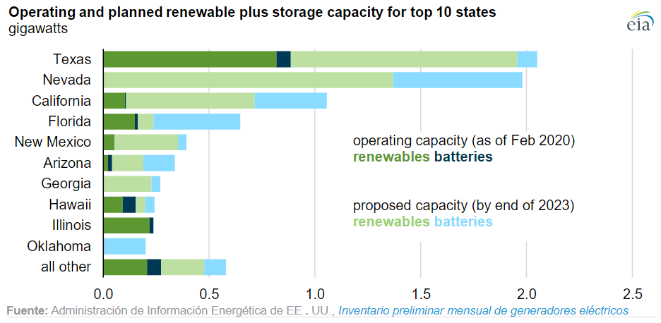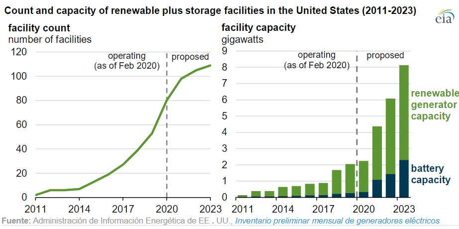Emparejar plantas generadoras de energía renovable con almacenamiento de energía, particularmente baterías, es cada vez más común a medida que el costo del almacenamiento de energía ha ido disminuyendo. El último inventario de generadores eléctricos de la Administración de Información de Energía de EEUU (EIA) muestra que el número proyectos de generación solar y eólica ubicados junto con baterías ha aumentado de 19 en 2016 a 53 instalaciones en 2019. Y se espera que esta tendencia continúe: según las instalaciones previstas informadas a la EIA, otras 56 instalaciones que combinan energía renovable y almacenamiento en baterías se conectarán a la red hasta finales de 2023.