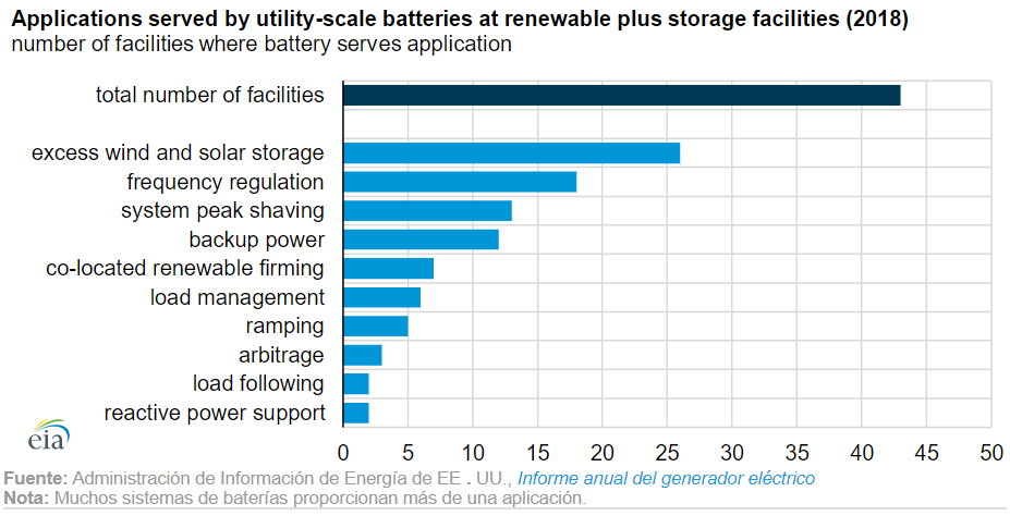 Aunque la aplicación más común de las baterías ubicadas junto con fuentes renovables es almacenar el exceso de energía, la mayoría de las baterías cumplen más de una función. La regulación de frecuencia es el segundo uso más común de las baterías ubicadas junto con las energías renovables. Las baterías también pueden proporcionar soporte de transmisión y distribución, ayudando a suavizar los flujos de energía. La capacidad de soportar la integración de las energías renovables en la infraestructura actual de la red, además de otros servicios auxiliares que realizan, como la regulación de frecuencia, son los principales impulsores del crecimiento de las baterías renovables.