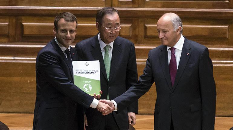 El presidente francés, Emmanuel Macron, asistió en París a la presentación de un proyecto de pacto mundial por el medio ambiente que busca convertirse en un futuro en un tratado internacional adoptado por la Asamblea General de la ONU.