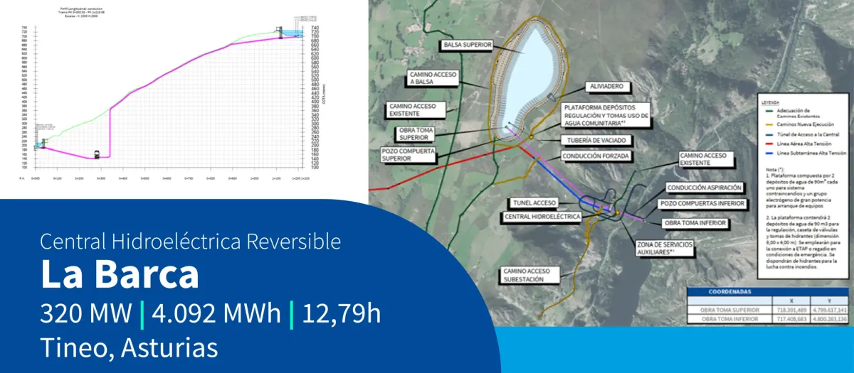 La Central Hidráulica Reversible La Barca, situada en Tineo (Asturias), es una infraestructura diseñada para aportar gestionabilidad, firmeza y estabilidad al sistema eléctrico. Con 320 MW de potencia, una capacidad de almacenamiento energético de 4.092MWh y un tiempo de descarga de 12,79h, la central permitirá integrar de forma eficiente la energía procedente de fuentes renovables no gestionables, reduciendo vertidos y reforzando la seguridad de suministro.