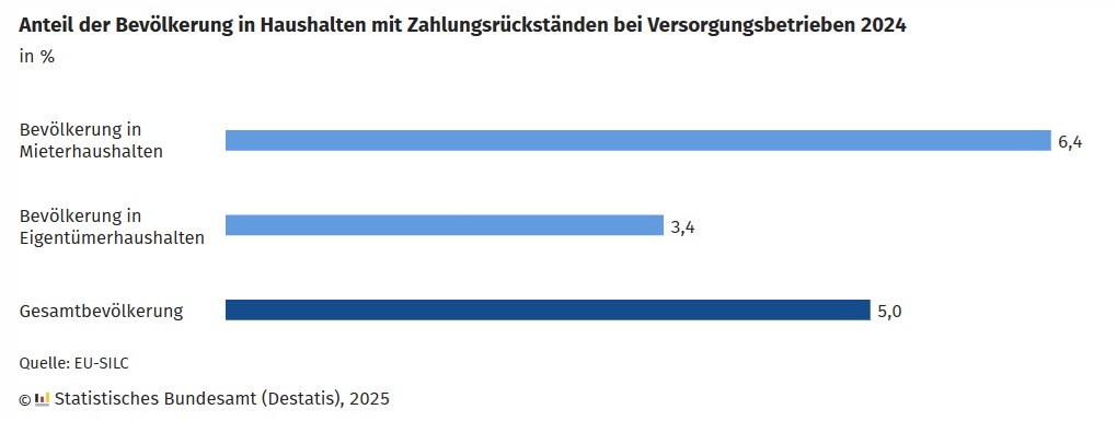 Alrededor de 4,2 millones de personas vivían en 2024, según sus propias declaraciones, en hogares que se encontraban en mora en el pago de facturas de servicios públicos, como electricidad o gas. Esto correspondía al 5,0 % de la población, según informó la Oficina Federal de Estadística (Destatis) basándose en los resultados de la encuesta sobre ingresos y condiciones de vida (EU-SILC).