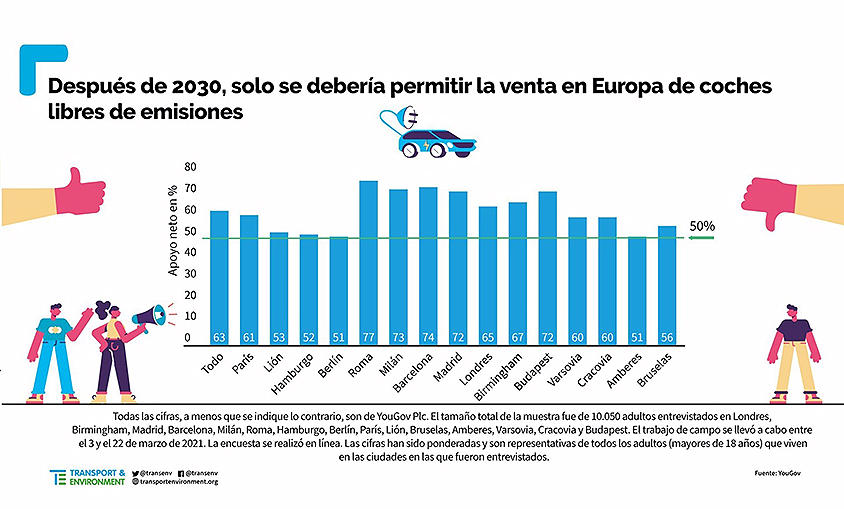 "Los ciudadanos de Madrid y Barcelona se encuentran entre los más firmes partidarios de poner fin a la venta de coches de combustible fósil en la Unión Europea. Los habitantes de las ciudades son los más expuestos a los niveles tóxicos de contaminación atmosférica, y no quieren que se vendan motores de combustión interna durante más tiempo del necesario", ha indicado la directora de T&E en España, Isabell Büschel.