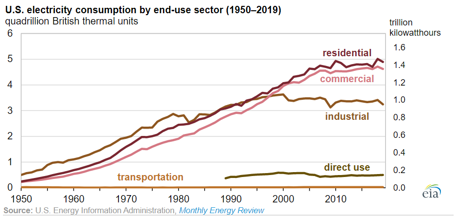 En términos de uso final, casi todos (96%) de los 13.3 quads de electricidad utilizados en Estados Unidos durante 2019 se entregaron como ventas minoristas a cuatro sectores de uso final (residencial, comercial, industrial y transporte). El 4% restante fue utilizado directamente por las instalaciones en los sectores comercial e industrial. Los sectores residencial y comercial representaron casi el 75% de las ventas minoristas de electricidad en 2019.