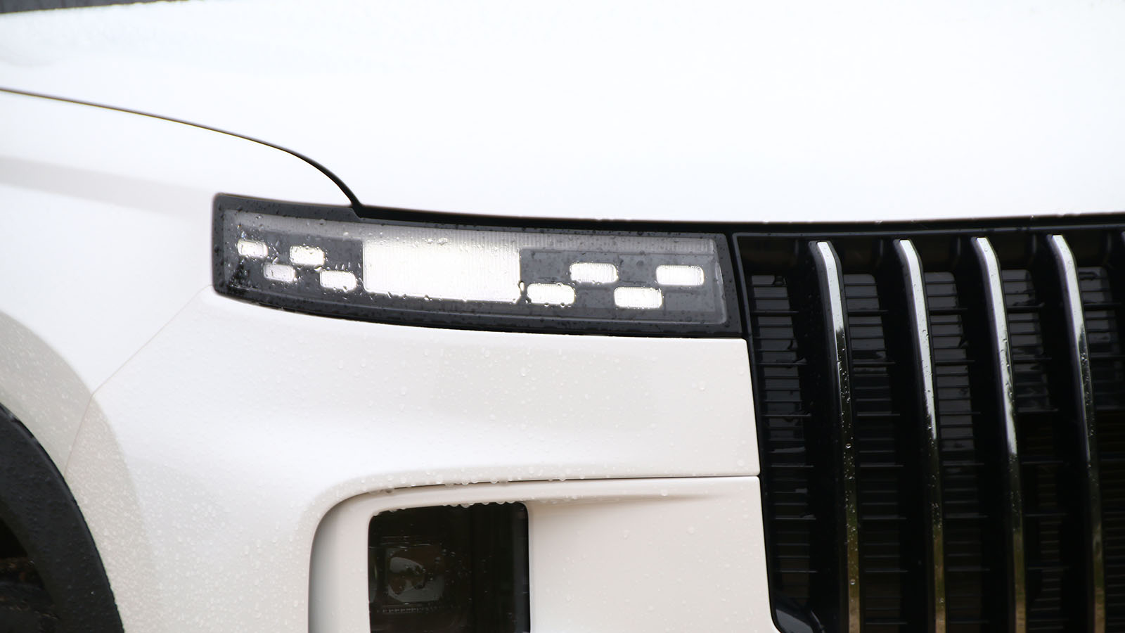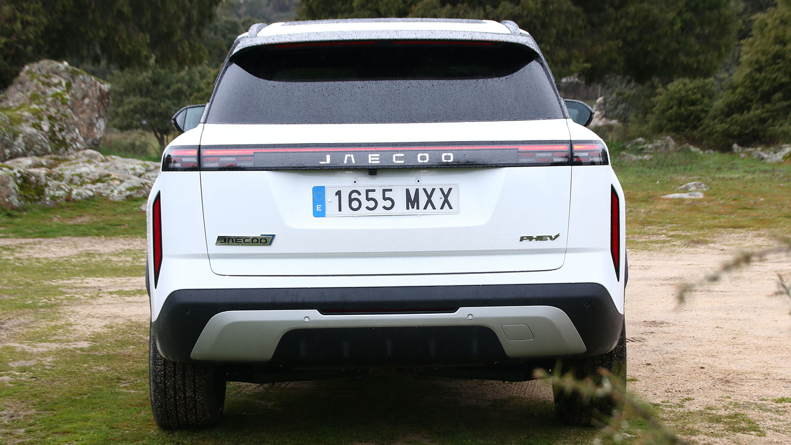 Como en otros modelos, el primer punto que te traigo es el diseño. No solo porque la versión de gasolina y este SHS no se diferencien a excepción del logo trasero, de la toma de carga o las llantas de aleación de 19 pulgadas, sino porque en líneas generales este Jaecco 7 entra por los ojos. Desde este frontal robusto y poderoso con esta calandra segmentada en lamas hasta una zaga ancha que a mí me recuerda a la del Range Rover Evoque. Todo ello sin obviar la pintura bicolor o la llamativa iluminación delantera con los faros diurnos simulando píxeles, mientras que los traseros ofrecen esa tira trasera que enfatiza su cota de anchura.