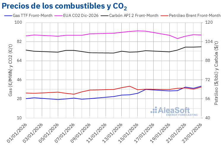 Por lo que respecta a los futuros de derechos de emisión de CO₂ en el mercado EEX para el contrato de referencia de diciembre de 2026, el lunes 19 de enero registraron un precio de cierre de 88,16 €/t, que se situó un 4,2% por debajo del registrado el viernes de la semana previa. El mínimo semanal se alcanzó el martes 20 de enero, cuando el precio de cierre cayó hasta los 84,94 €/t, un 3,7% inferior al día anterior. Posteriormente, los precios se recuperaron y el máximo semanal se registró el jueves 22 de enero, con un precio de cierre de 88,48 €/t, aunque este valor se situó un 3,9% por debajo del precio de cierre del viernes anterior. El viernes 23 de enero el precio de cierre bajó ligeramente, un 0,1%, situándose en 88,41 €/t.