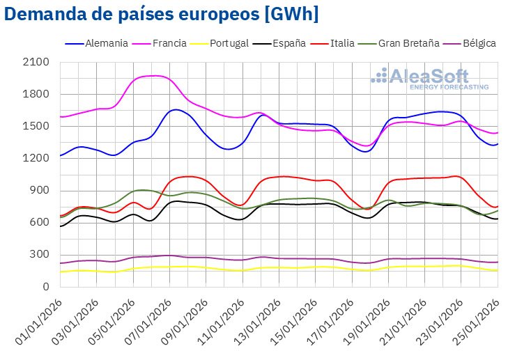 Para la semana del 26 de enero, según las previsiones de demanda de AleaSoft Energy Forecasting, la demanda aumentará en los mercados de Gran Bretaña, Francia, Portugal, Bélgica e Italia. En cambio, los mercados de Alemania y España registrarán un descenso de la demanda.