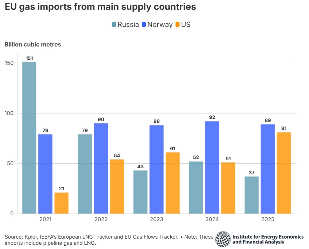 Tras la invasión a gran escala de Ucrania por parte de Moscú en 2022, la UE ha reducido gradualmente su dependencia del gas ruso. Las importaciones del bloque de gas ruso (incluido el gas por gasoducto y el GNL) cayeron un 75% entre 2021 y 2025. A pesar de este cambio, Rusia sigue siendo uno de los mayores proveedores de gas de la UE.