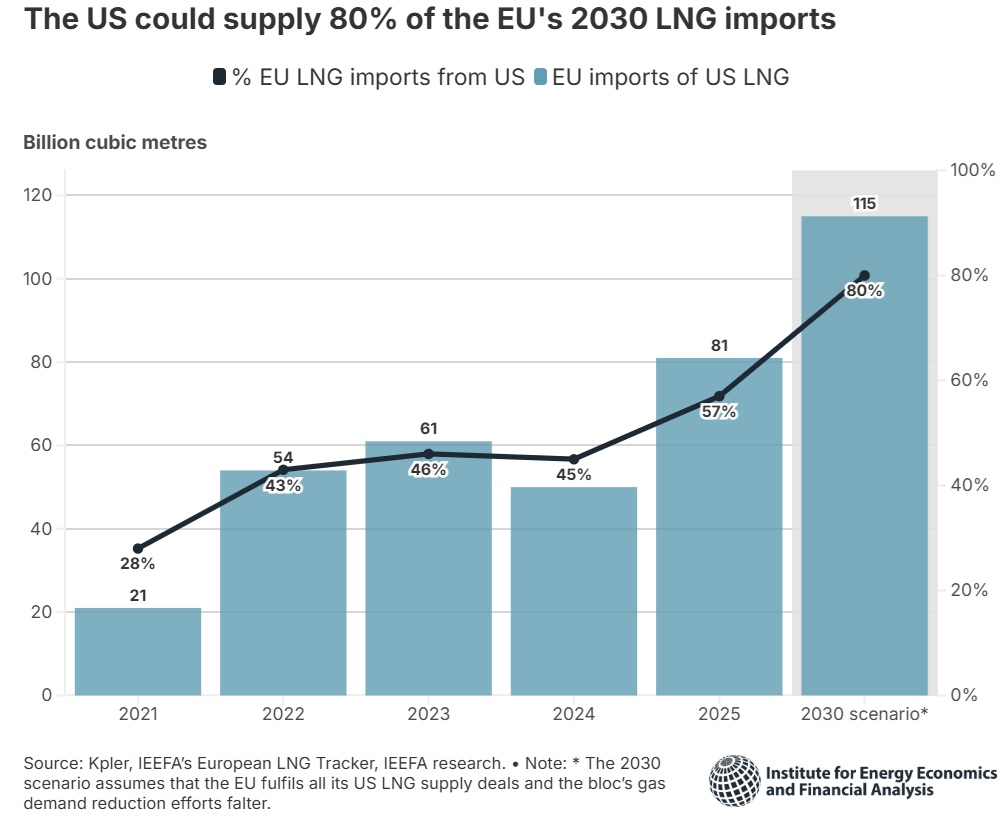 IEEFA ha calculado un escenario para 2030 en el que todos estos acuerdos se materializan y los esfuerzos de reducción de la demanda de gas de la UE fracasan. Los acuerdos podrían aumentar las importaciones de GNL estadounidense de la UE hasta unos 115 bcm anuales para 2030, lo que significaría que entre el 75 % y el 80 % de las importaciones de GNL del bloque procederían de EEUU.