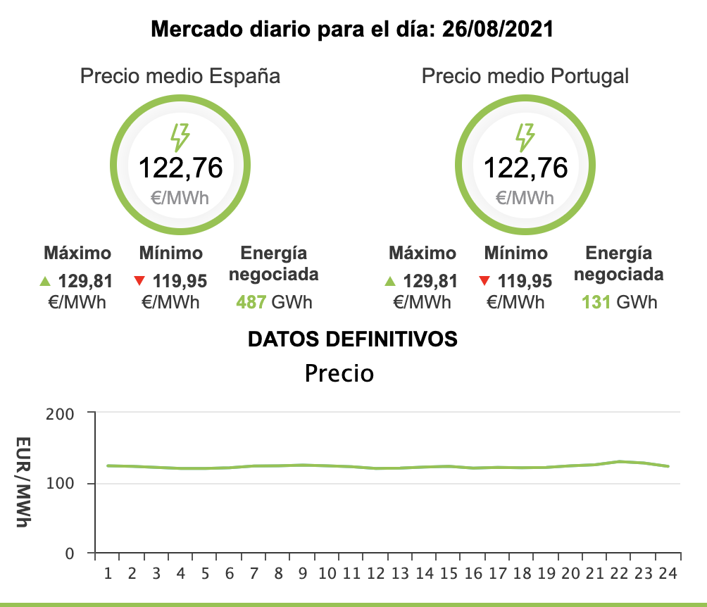 Eel precio horario máximo del día será de 129,81 €/MWh que se dará a las 22.00 horas, mientras que el precio más bajo será de 119,95 €/MWh.