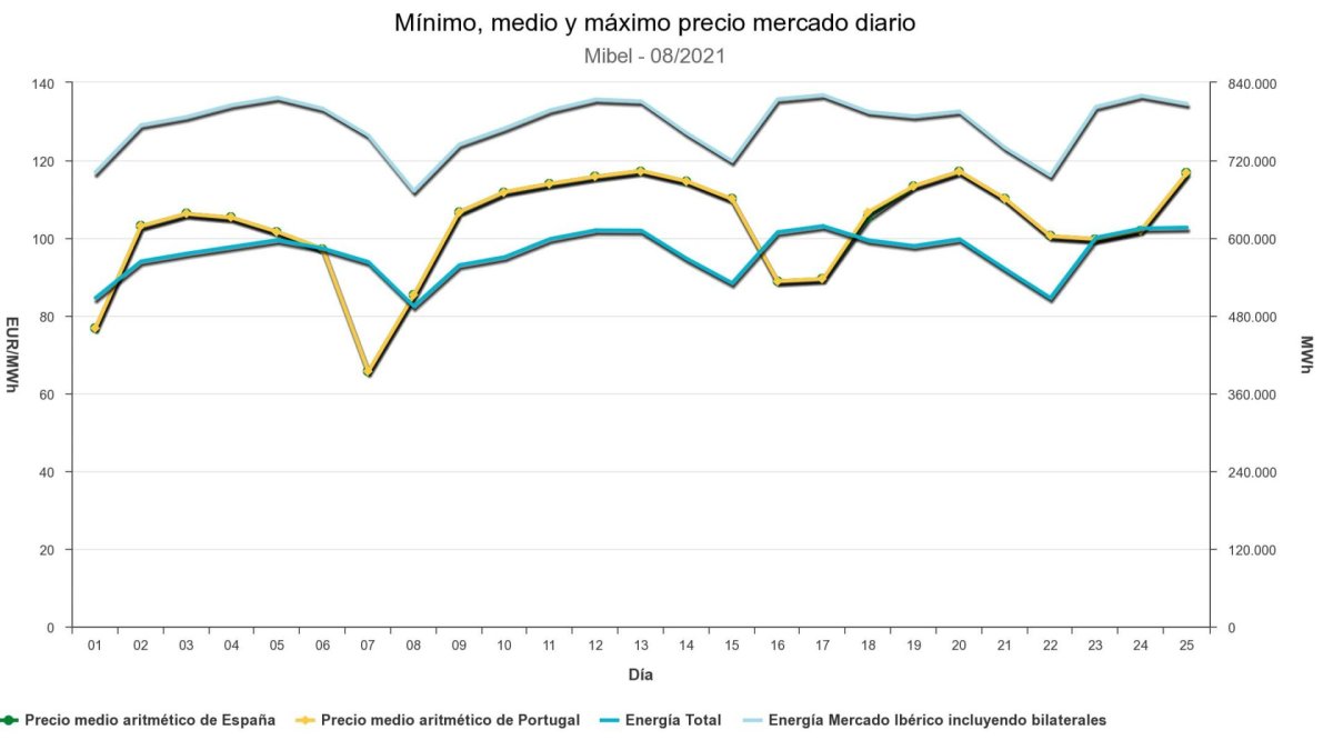 La escalada de precios durante este mes de agosto es de tal calibre que por primera vez un mes va a arrojar un precio medio por encima de los 100 €/MWh. Sólo cinco de los 25 días del mes se han situado por debajo de este precio.