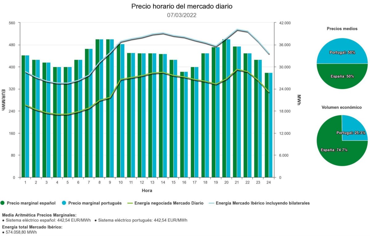 Además, el precio de este lunes es unos 63 euros más caro que el marcado el domingo, de 379,03 euros/MWh, según datos publicados por el Operador del Mercado Ibérico de Energía (OMIE) recogidos por Europa Press.