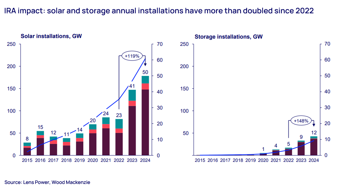 La Ley de Reducción de la Inflación (LIR) ya ha tenido un impacto significativo en la industria energética. Las instalaciones solares y de almacenamiento en 2024 se duplicaron sobre las de 2022, pero este éxito está bajo amenaza. La incertidumbre política y los cambios de política bajo una administración Trump tienen el potencial de perturbar la industria. Las posibles modificaciones de la IRA podrían provocar un fuerte descenso de las inversiones en renovables, causando una reducción del 30% o más.