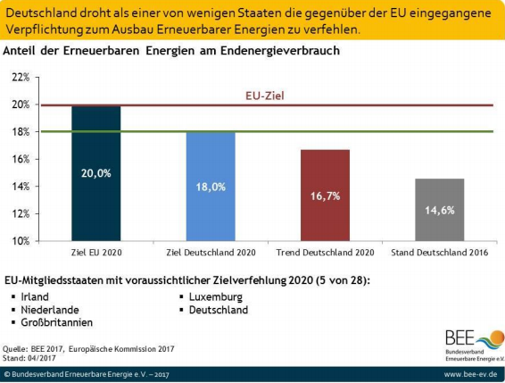 Junto a Alemania, Irlanda, Luxemburgo, Países Bajos y Reino Unido también podrían incumplir sus objetivos de 2020, mientras que los otros 23 países de la UE ya han cumplido con sus compromisos. La proporción de energías renovables en el sector eléctrico de Alemania aumentó sólo un 0,2% hasta el 31,7% el año pasado, debido a un desarrollo más lento de lo esperado de las energías renovables en los sectores de calor y de transporte, (ver gráfico) dijo el CEO provisional de BEE, Harald Uphoff.
