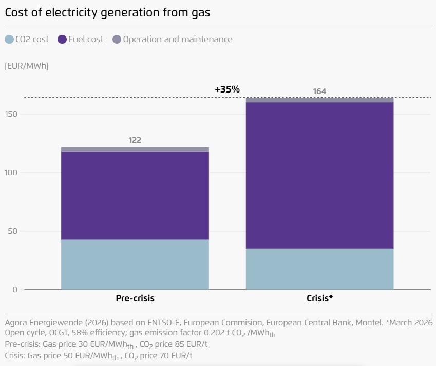 Si bien estas caídas en la demanda de combustibles fósiles, impulsadas por la crisis, no sustituyen una transformación estructural, demuestran cómo el Sistema de Comercio de Emisiones de la UE (EU ETS) puede proteger a la industria de los picos de precios en lugar de incrementar los costos. Durante la actual crisis energética, los precios del CO₂ han caído alrededor de un 18%, lo que ha contribuido significativamente a la reducción de los costos de generación relacionados con el carbono.